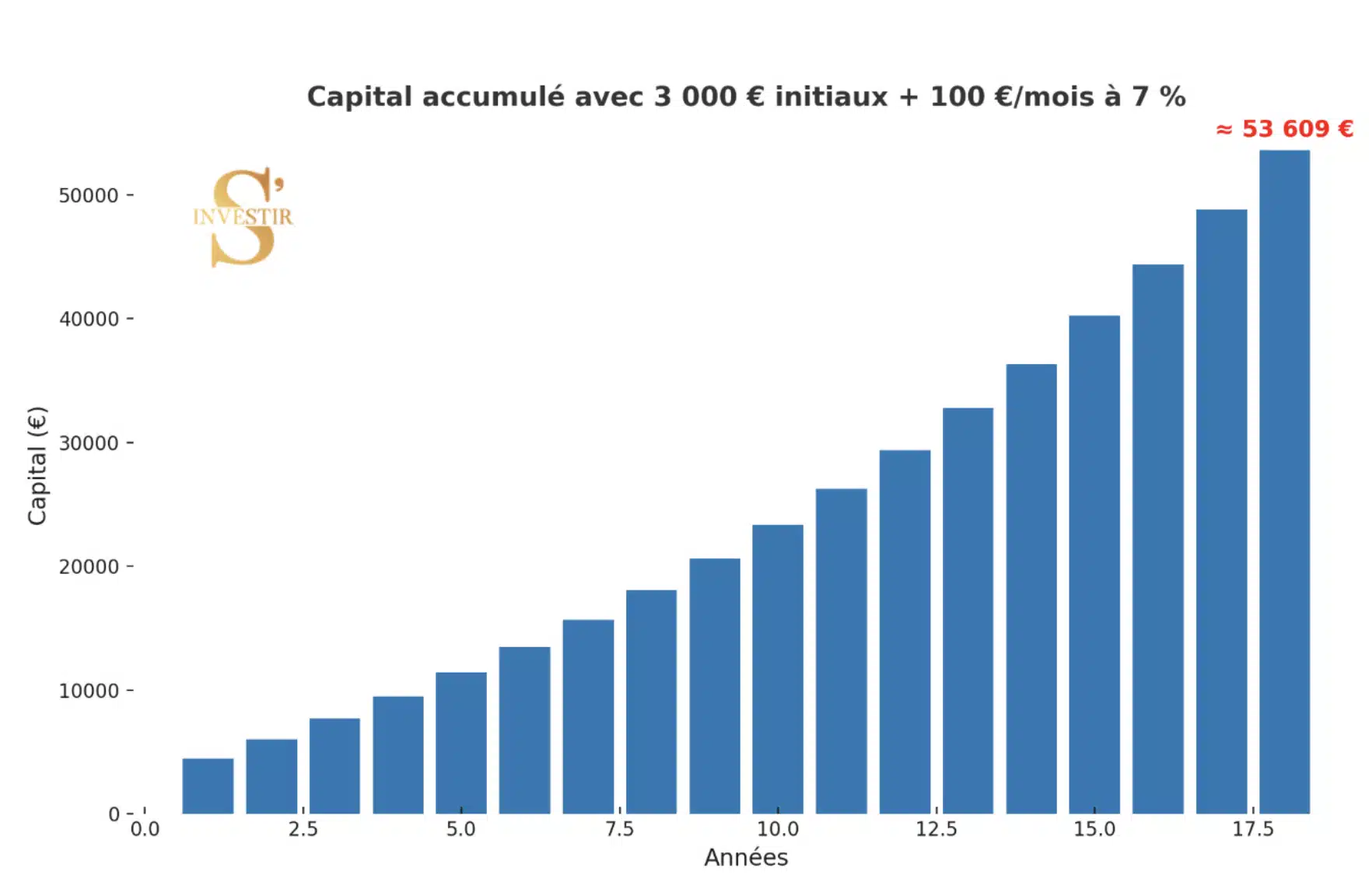 Projection de long terme | Exemple : 3 000 € + 100 €/mois = ~55 000 € à 18 ans (rendement moyen 7 %) |