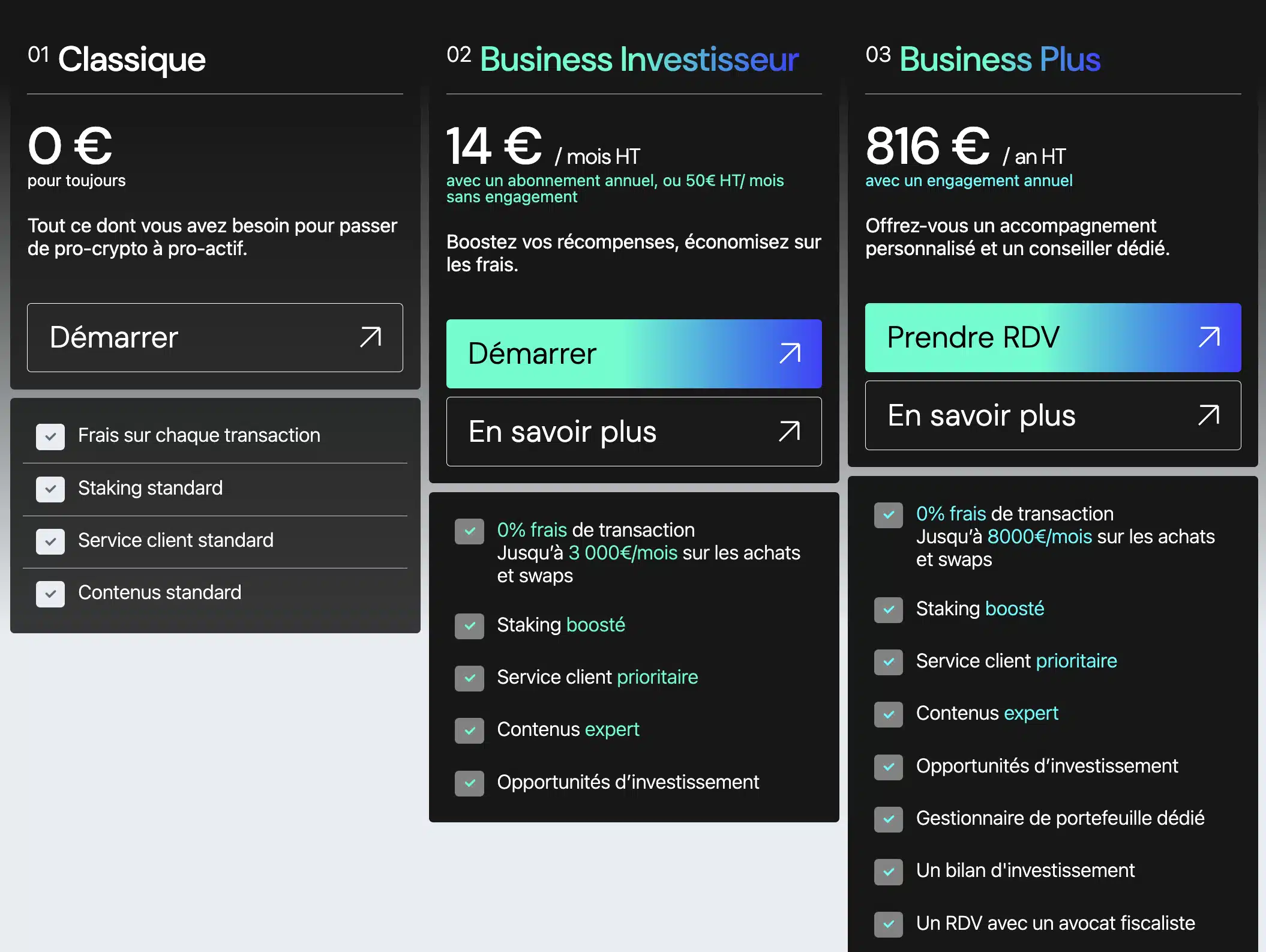 L’offre Binance pour entreprise ne diffère pas de l’offre pour les particuliers. En effet, à moins de basculer sur l’offre « services institutionnels » et avec les solutions VIP, vous n’aurez rien de spécialement adapté à vos besoins. Sachez que le premier palier de détention pour devenir VIP (actifs du portefeuille) est fixé à 500 000 dollars. Si vous aviez en tête de placer quelques centaines voire milliers d’euros en crypto, je vous déconseille fortement cette voie. Selon moi, ces plate-formes sont bien plus adaptées à des investisseurs particuliers et très peu aux entreprises.