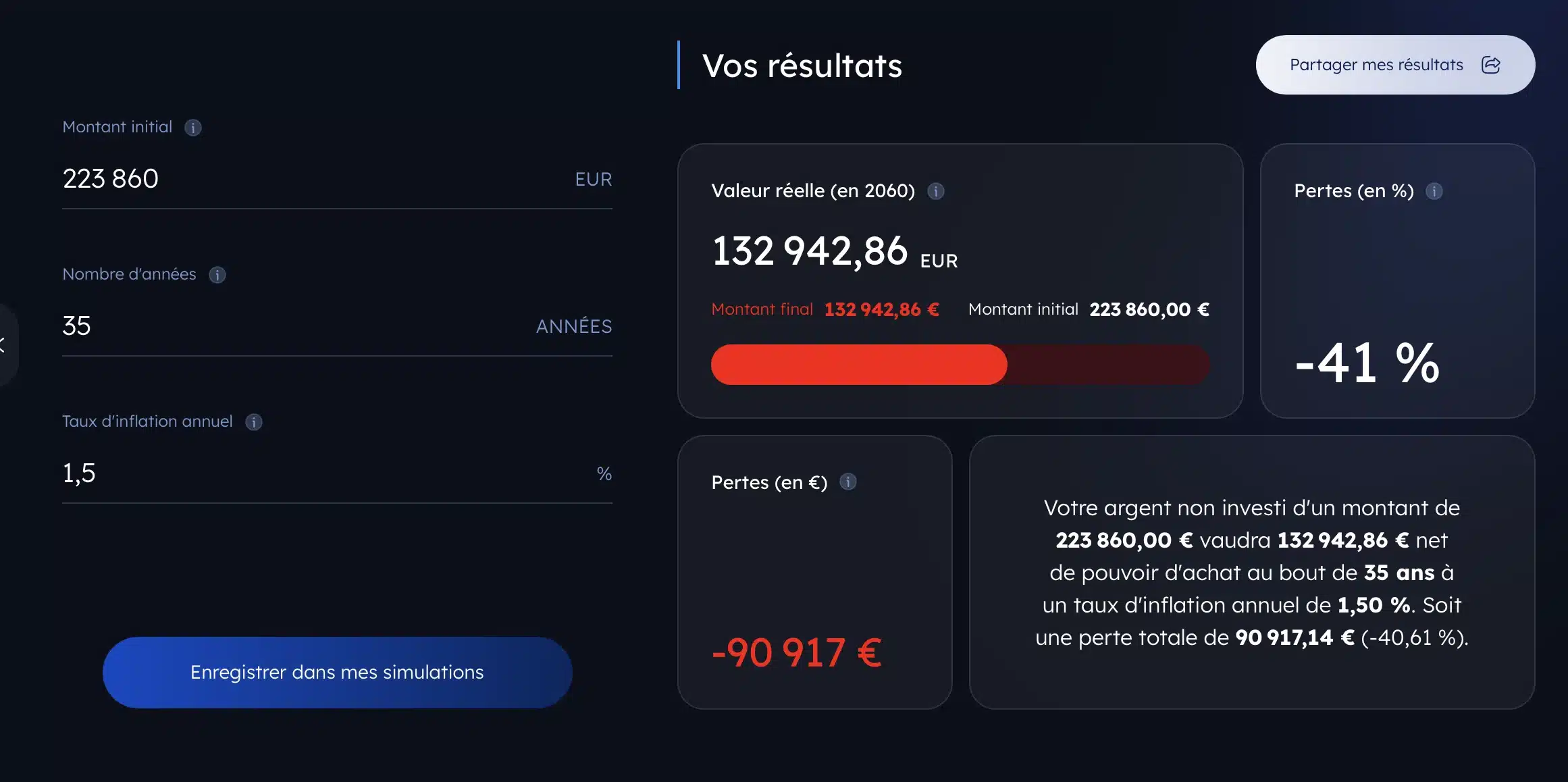 Votre capital réel, c’est-à-dire ce qu’il vaut en pouvoir d’achat d’aujourd’hui, n’est plus de 785 000 €… mais 466 000 €. 🫣