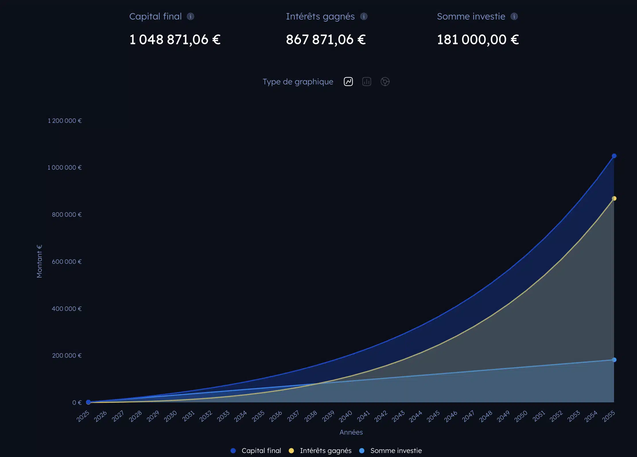 • 👉 500 € par mois aux mêmes conditions → environ 1 million d’euros