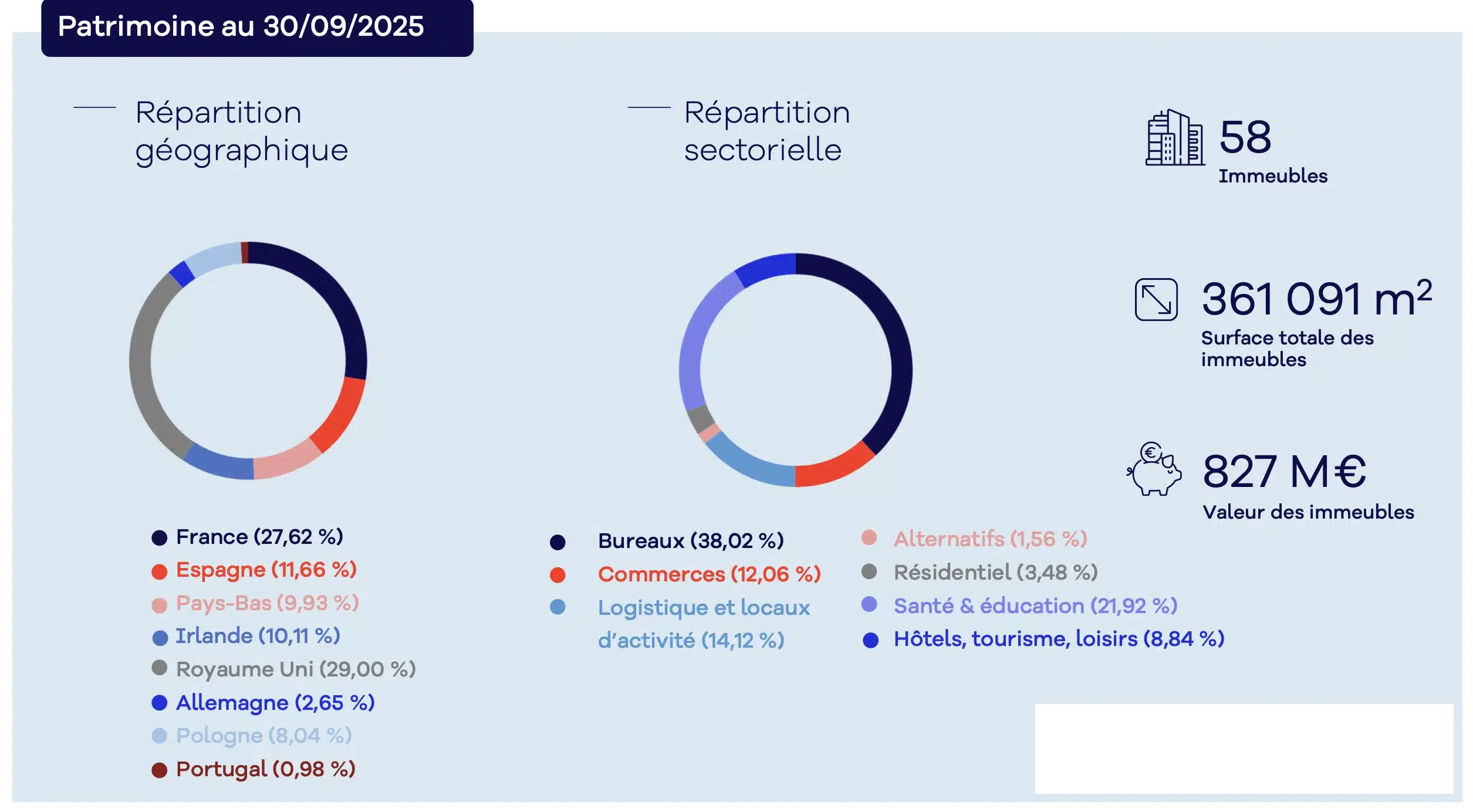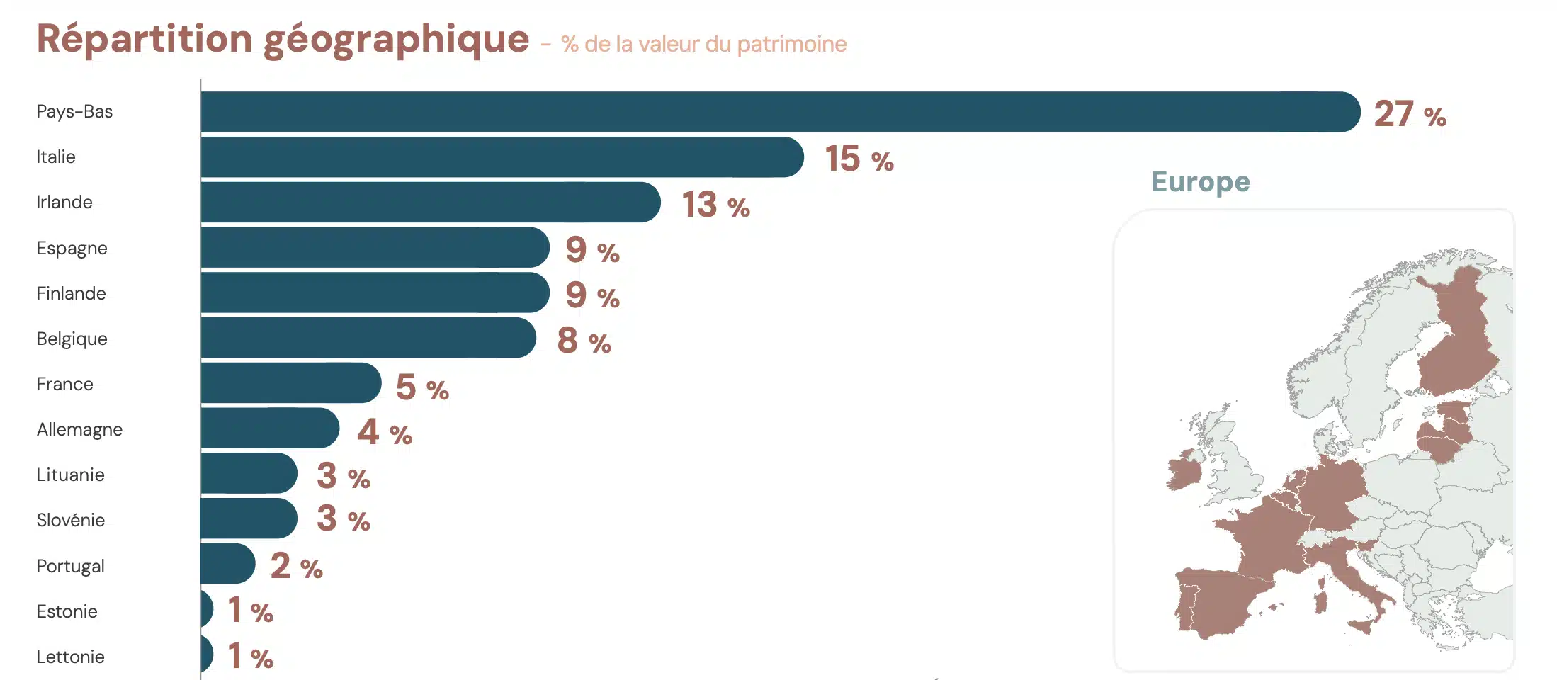 Première chose à regarder, la géographie. Moins de 15 % des biens sont situés en France. Tout le reste est investi dans d’autres pays européens, comme les Pays-Bas, le Royaume-Uni, l’Espagne, l’Allemagne ou encore l’Irlande.