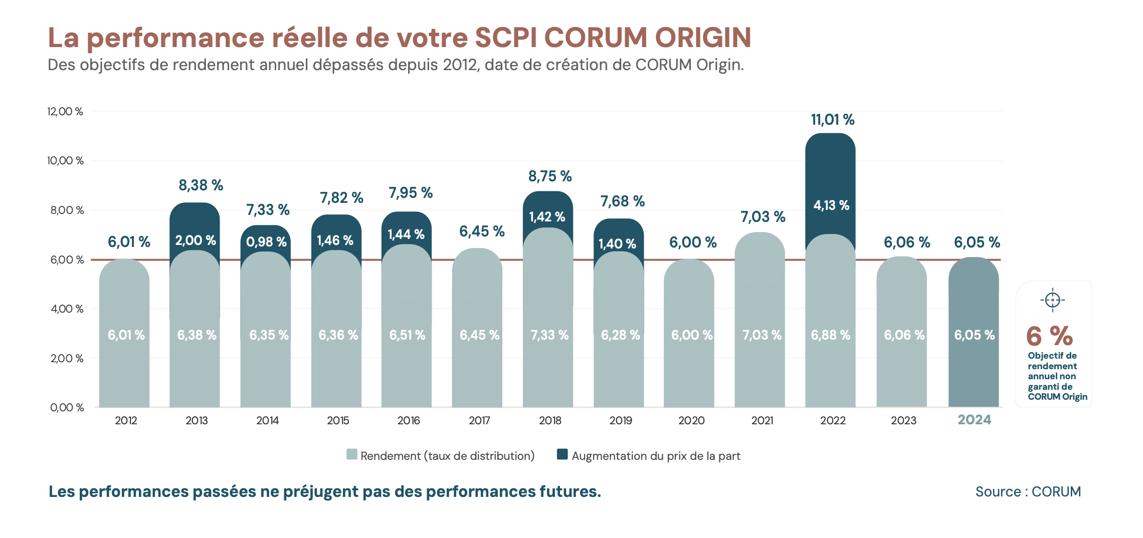 Ce que nous apprécions particulièrement chez Corum Origin, c’est son ancienneté et sa constance. Elle existe depuis plus de dix ans et affiche un historique de rendement très stable, toujours supérieur à 6 % depuis sa création. En 2023 et 2024, son taux de distribution atteint encore 6,05 %, accompagné de revalorisations successives du prix de la part.