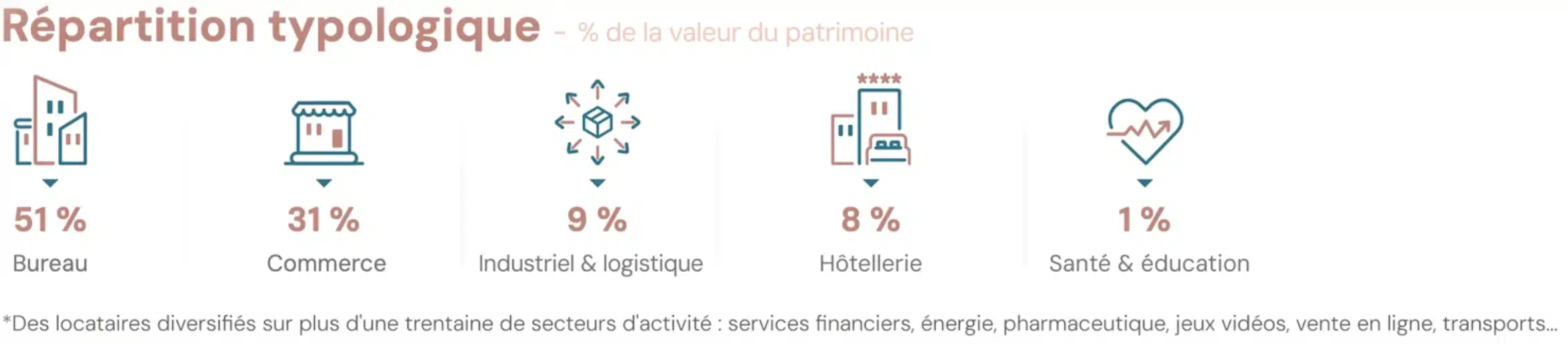 • La diversification typologique ensuite, en combinant bureaux, commerces, santé, éducation, logistique ou autres classes d’actifs immobiliers.