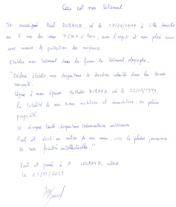 Ce testament illustre un cas très simple, où le testataire n’a pas d’enfant, et peut donc tout léguer à son épouse. Comme nous le verrons par la suite, le Code civil protège les héritiers réservataires dont les enfants font partie. Dans ce cas, le testateur ne peut pas leur léguer moins que le minimum imposé.