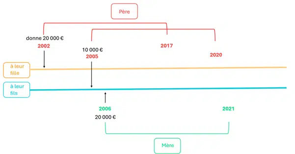 L’exemple ci-dessous illustre 2 parents faisant des dons à leurs 2 enfants. Le père débute la période de 15 ans avec sa fille, via un don de 20 000 € en 2002. Il a jusqu’en 2017 pour atteindre le plafond de 100 000 € de dons pour elle, s’il le souhaite et le peut. En 2005 s’ouvre la fenêtre de 15 ans avec son fils, avec un don de 10 000 €, qui se terminera en 2020. La mère a entamé la période de 15 ans avec son fils, mais pas encore avec sa fille.